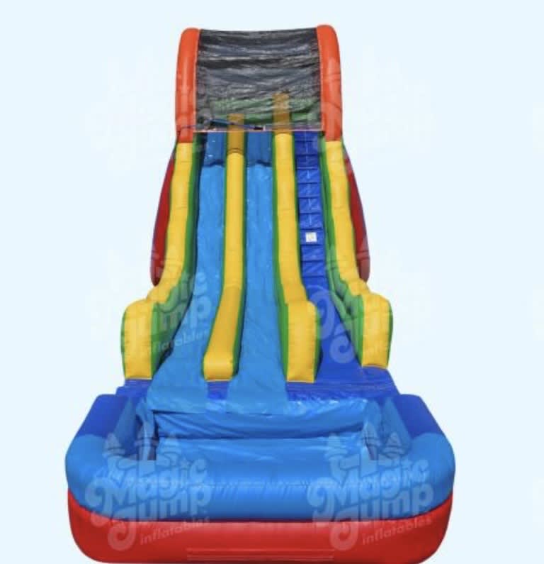 Upgrade your summer celebration with the 22’ Multi Mega Dual Water Slide. This monster slide is big and fast. It delivers park-style thrills at your backyard party. Perfect for birthday parties, graduations, celebration's, and summer fun. The slide features dual lanes and a huge splash pad for maximum excitement and cool-down. 🌞